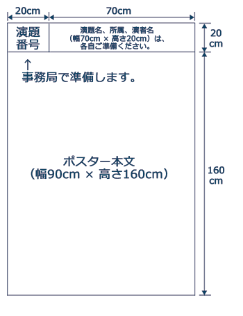 演題毎に横20cm ×縦20cm(下図参照)の演題番号のみ事務局で用意します。パネルの規格に従って、演題名、